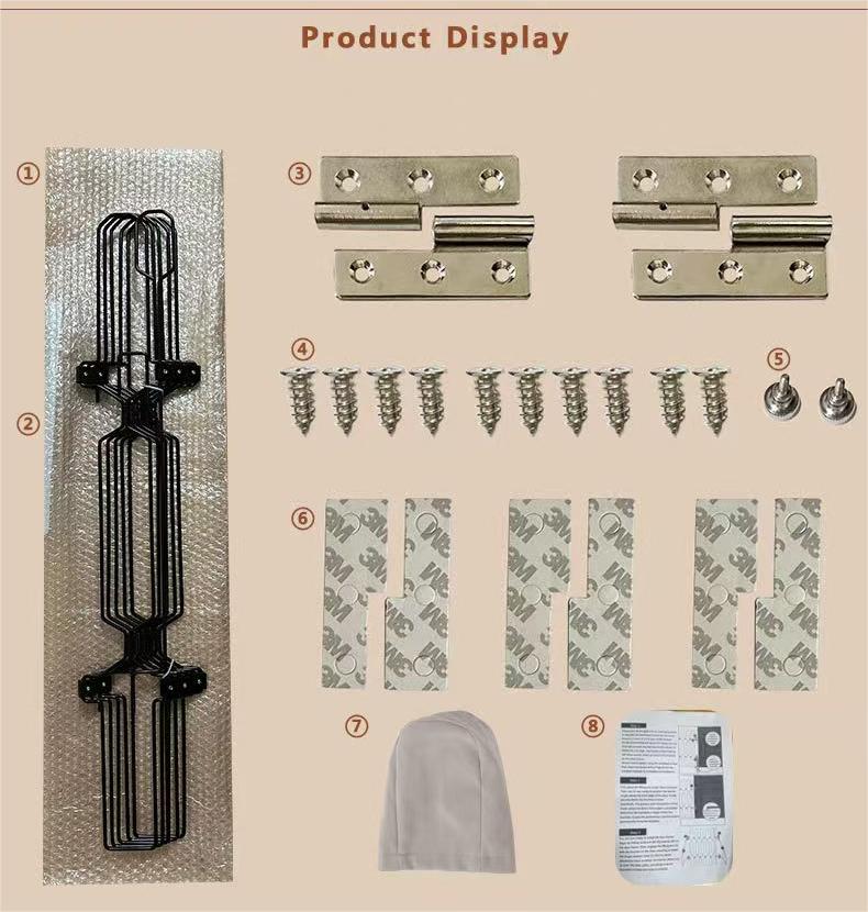 Included Components: 1.Protective Air Bubble Cushion × 1 2.Adjustable Safety Gate Frame (Main Unit) × 1 3.304 Stainless Steel Heavy-Duty Removable Hinges × 2 4.Hardened Steel Flat-Head Mounting Screws × 10 5.Hinge Mounting Brackets × 2 6. EVA Foam Hook Strips × 3 sets 7. Dust-Resistant Storage Bag × 1
